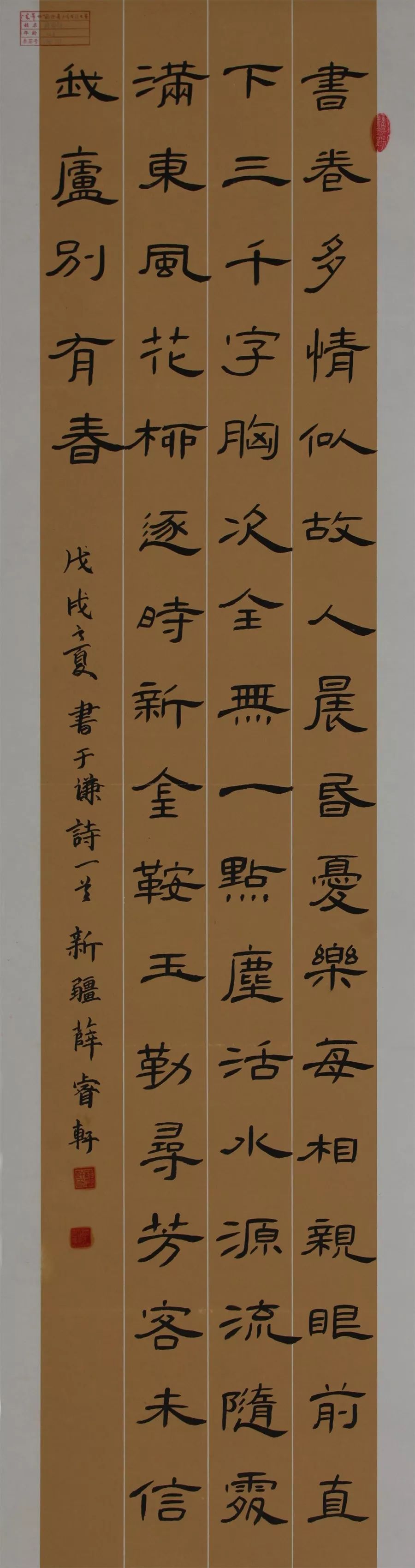薛睿轩,女,2006年8月生,新疆哈密人。就读于哈密市第五小学六年级(2)班。2014年从师戴刚老师学习欧体楷书,2016年从师陈斌老师学习隶书《曹全碑》、篆书《峄山碑》。获奖经历:2015年3月获哈密市第五中学“校园艺术之星”荣誉称号;2015年10月获哈密市第五小学“纪念少年队建队60周年”书法作品比赛一等奖;2016年6月获哈密军分区“庆六一”书法比赛优秀奖;2016年12月获哈密市青少年书法网络大赛获儿童组第一名;2017年8月参加“中国梦·丝路情”全国青少年书法大赛新疆唯一作品入展;2017年11月获“民族团结一家亲”——第二届“华文杯”新疆中小学生书法大赛获二等奖;2018年7月获2018首届“米芾杯”国际青少年书法大赛少年组一等奖。