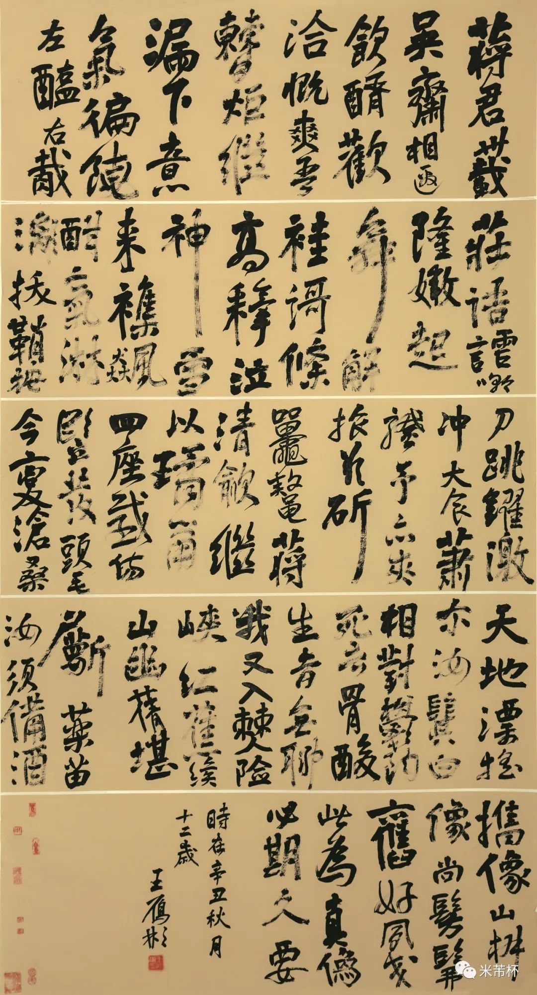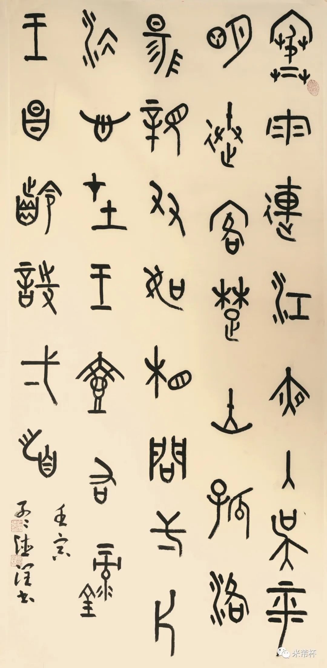 首届“米芾杯”全国青少年书法教师作品展展出优秀书法篆刻作品(米芾奖)7件、书法篆刻入展作品123件,共计130件。本届作品展从参展作者的年龄来看,既有刚成年的在校大学生,也有耄耋之年的老书家,跨越了“老中青”三代,实现年龄“全覆盖”,从而凸显出本次活动的公益性、开放性和普惠性。从参展作品的取法来看,既有取法经典、追慕古贤,也能对民间“非经典”的书迹有所涉猎,呈现出多样丰富的特点。且能根植传统知变通,从而创作出传统功力与创造性兼具的作品。